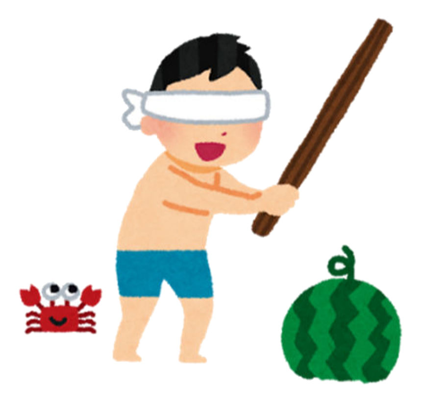 | 目隠しされた子どもが竹の棒を持って行先不確かなスイカにたどたどしい歩みで向かいます。それを友だちが口々に必死に応援して助けます。「頑張れ」「まだまだ」とか、「もう少し前」「あ~あ、ぜんぜんちがう」などと。よく見られる「スイカ割り」の光景が展開されました。そんな中で気づかされた一つの事柄があります。それは、「右」「左」というコトバの理解が子ども達の世界にまだしっかりと根づいていないということでした。「もっと右に」と応援する声はほとんどありませんし、先生が「**ちゃん、もう少し左よ」と応援してもその通りに正しく動けた子どもがほとんどいなかったからです。 | ||
